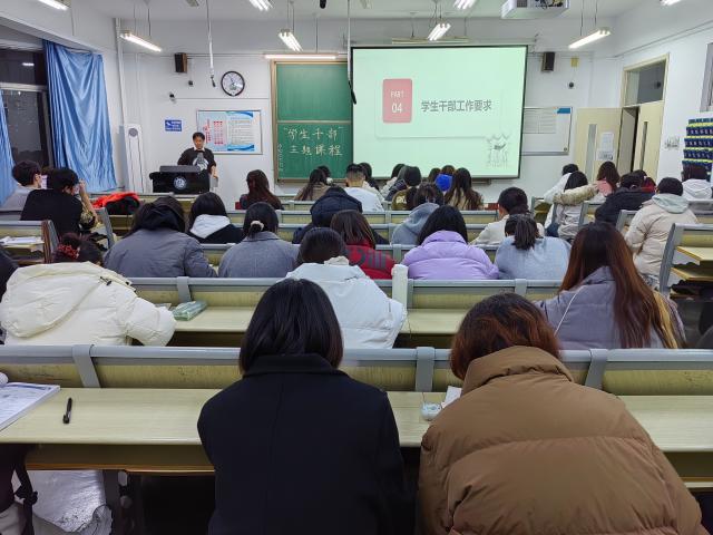 刘强以提升学生干部工作能力、提高部门工作效率为出发点,围绕学生干部是什么、怎样履行职责以及如何做好组织工作三个问题开展主题培训课程。宣讲过程中,刘强从阐述学生干部的定义切入,指出学生干部是协助老师、服务同学的学生代表,要时刻坚守全心全意为同学服务,全心全意为同学做实事的核心要义,真正做到心系同学,权为同学。针对学生干部如何认清职责等问题,刘强提出学生干部要提升团队有效沟通能力、权衡学习压力与工作重担的建议,帮助干部找准团队站位,合理分配工作职责,促进部门协调发展。随后,刘强以自身经历为基础分享经验,强调学生干部要培育未雨绸缪的超前意识,善于抓住并解决关键性问题,强化组队分工协作的指挥能力,更要有宣传动员的号召力和强大的团队组织力。在场学员反响热烈,纷纷表示要坚持为同学服务的工作路线,要时刻牢记学生干部工作原则,发挥学生榜样的引领示范作用。