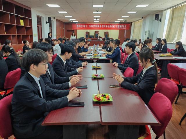 活动伊始,全体参会人员起立奏唱国歌,主持人宣读新一批入团团员名单,时林超和孟冠军为新团员颁发团员证并佩戴团徽,新团员在领誓人带领下庄严宣誓完成入团仪式。随后,陈星宇讲述“五四星火传不息,青春建功正当时”主题微团课,分享与扎根西部校友的交流经历,阐释爱国进步精神在乡村振兴、边疆建设中的时代传承,并立足法学专业特点提出“涵养法治情怀、精研专业本领、投身基层实践”的行动路径,激励参会人员在法治中国建设中诠释新时代五四精神。