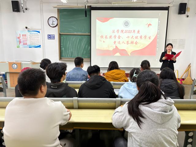 答辩过程中,吴承卿、孟文慧、王士宇、刘雨哲四位答辩人先后登场,分别围绕专业成绩、科创赛事成果、社会实践服务等核心维度,结合自身实际发展状况和实践经历进行阐述,展现其扎实优异的专业素养、突出的综合实力和不懈的进取精神。此外,答辩人展示在校期间收获的多项荣誉及全心全意为同学服务的实践成果,尽显自身卓越风采和弘毅担当。在点评环节,陈星宇对答辩人在学习、科创、实践等方面的综合表现予以高度肯定,希望他们坚持刻苦奋斗、开拓创新,做学院优秀学风建设的有力引领者。刘洁在最后总结中对答辩人优异的学业表现和积极的成长态度表示赞赏,并向在场学生提出发展建议,要以优秀学生为榜样,于学术深研、志愿服务中,不断精进自身专业基础和实践能力,努力成长为硬软实力协同发展的复合型法治人才。在场学生深受鼓舞,纷纷表示要自觉向优秀学生代表看齐,踏实学习、深入实践,明晰成长路径,更好地规划大学生活。