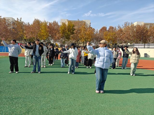 健美操设计融合舒缓拉伸与活力律动,针对颈肩腰等关键部位设置放松环节,同时加入提升协调性的组合动作,整套编排兼顾科学性与实用性,强度适宜、易于掌握。学生精神饱满、队列整齐,在明快的音乐节奏中连贯完成从基础伸展到复杂转换的系列动作,肢体舒展自然流畅,姿态控制稳定到位。抬手弯腰间展现着青春的柔韧与力量,踢腿跳跃中洋溢着蓬勃的朝气与活力,整齐划一的动作编排体现出团队协作的高度默契,更传递出积极进取的精神面貌。整个活动过程秩序井然,学生在轻松愉悦的氛围中专注投入,通过系统性的身体训练有效缓解日常学习带来的疲劳感,展现出法科学子良好的身体素养与纪律观念,集体运动的协同效应得到充分体现。