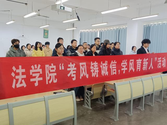 此次活动紧扣诚信参加考试、建设优良学风这一主题,从考纪宣讲、经验分享、宣誓签名三个环节展开。活动过程中,主讲人围绕考试注意事项、考试纪律要求等多方面具体讲解,明确划定诚信应考的红线和底线,严肃指出考试作弊对个人发展、班级风气、社会诚信建设产生的不良影响,要求在场学生坚守诚信底线,严守考试纪律。随后,2024级学生顾颖针对法学特点分享自身备考经验,她提出制定动态切实的复习计划、梳理清晰知识框架是实现高效复习的重要途径,并强调学生应保持良好的考试心态,及时缓解焦虑情绪,以从容的姿态应对每一场考试。最后,全体学生在宣誓人的带领下,面对“考风铸诚信,学风育新人”的横幅庄严宣誓,并依次有序签名,将诚信应考的承诺具象化落实,进一步强化在场学生的诚信意识和规则意识。